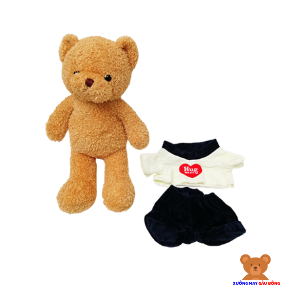 Trang phục của gấu bông bé trai là quần đùi xanh than kết hợp áo cộc tay trắng.