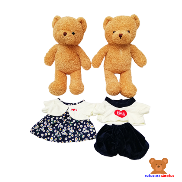 Gồm 2 kiểu trang phục: gấu bông bé gái mặc kiểu váy hoa nhí màu xanh than kết hợp áo lửng màu trắng.