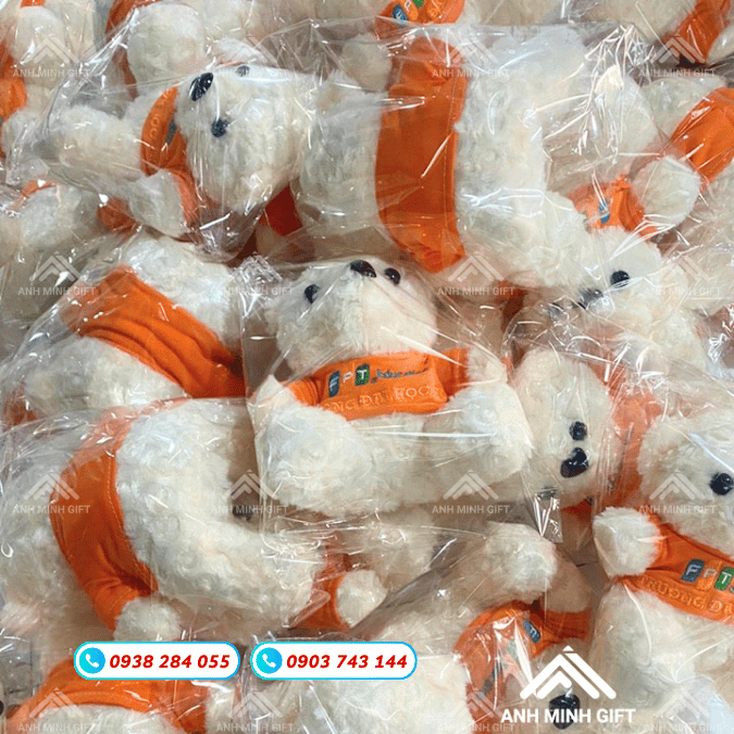Tại Anh Minh Gift, chúng tôi cung cấp nhiều phương án sáng tạo để biến một chú gấu thông thường trở thành đại sứ thương hiệu độc quyền. Doanh nghiệp có thể lựa chọn mẫu gấu bông in logo lên áo thun tí hon mặc cho gấu, hoặc tinh tế hơn là thêu trực tiếp tên công ty lên bàn chân hoặc nón.