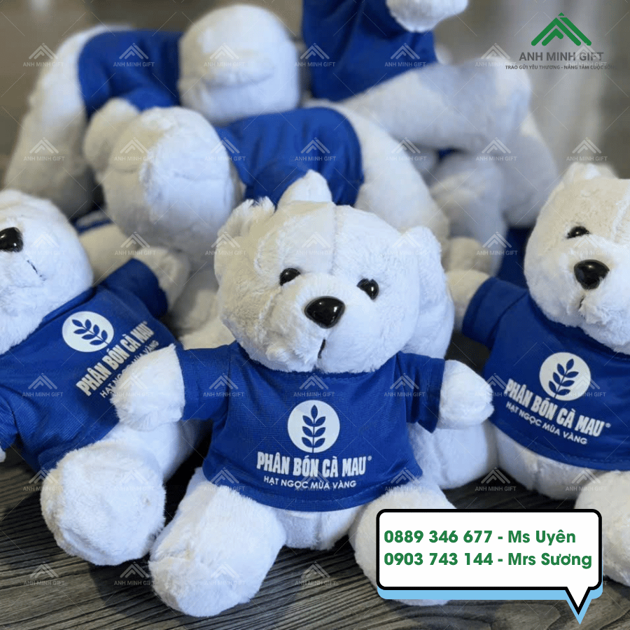 Gấu bông mặc áo thun in logo: Đây là lựa chọn phổ biến nhất vì chi phí hợp lý và diện tích in logo trên áo rất lớn, dễ nhận diện.