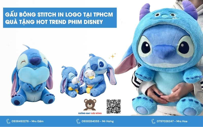 Với sự ra mắt của phim Lilo & Stitch phiên bản mới, gấu bông Stitch in logo đang trở thành món quà tặng hot trend được yêu thích nhất hiện nay. Tại TPHCM, nhu cầu đặt làm gấu bông Stitch in logo theo yêu cầu và in logo doanh nghiệp lên gấu bông Stitch đang tăng cao đáng kể từ các công ty, shop, và thương hiệu.