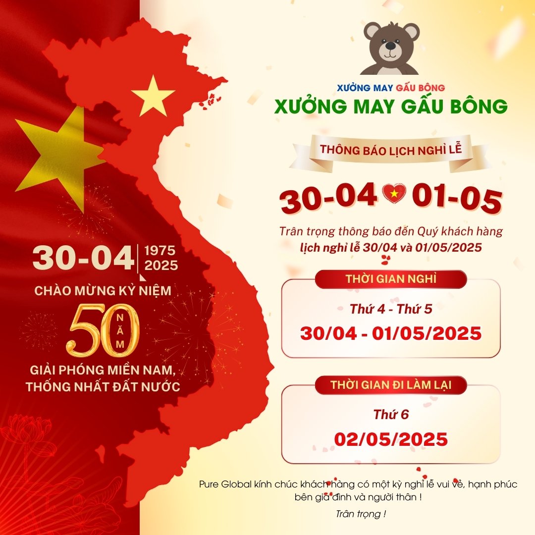 XƯỞNG MAY GẤU BÔNG xin trân trọng thông báo lịch nghỉ lễ Giải phóng miền Nam 30/4 và Quốc tế Lao động 1/5 năm 2025