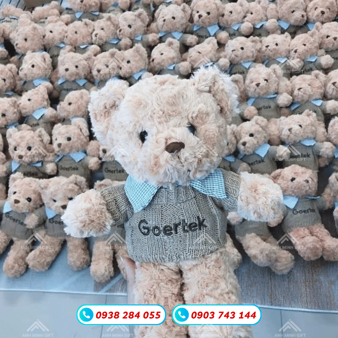 Anh Minh Gift - Xưởng sản xuất gấu bông in logo theo yêu cầu uy tín 2026. Chuyên gấu bông mặc áo cờ đỏ, đội nón lá quà tặng sự kiện. Giá sỉ tận xưởng, thêu logo sắc nét.