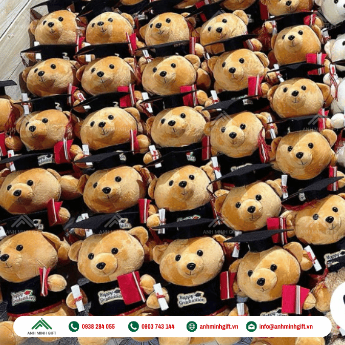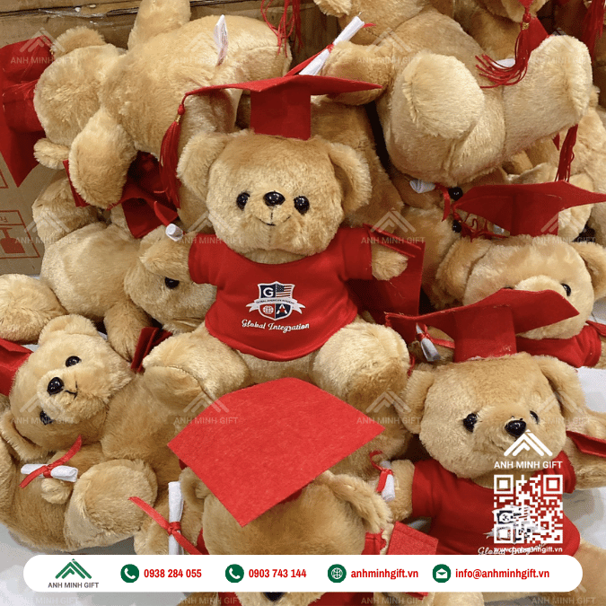 Xưởng sản xuất gấu bông tốt nghiệp in logo trường học giá sỉ tốt nhất tại TPHCM. Anh Minh Gift cam kết gấu cử nhân chất lượng cao, thêu sắc nét, an toàn cho trẻ em.